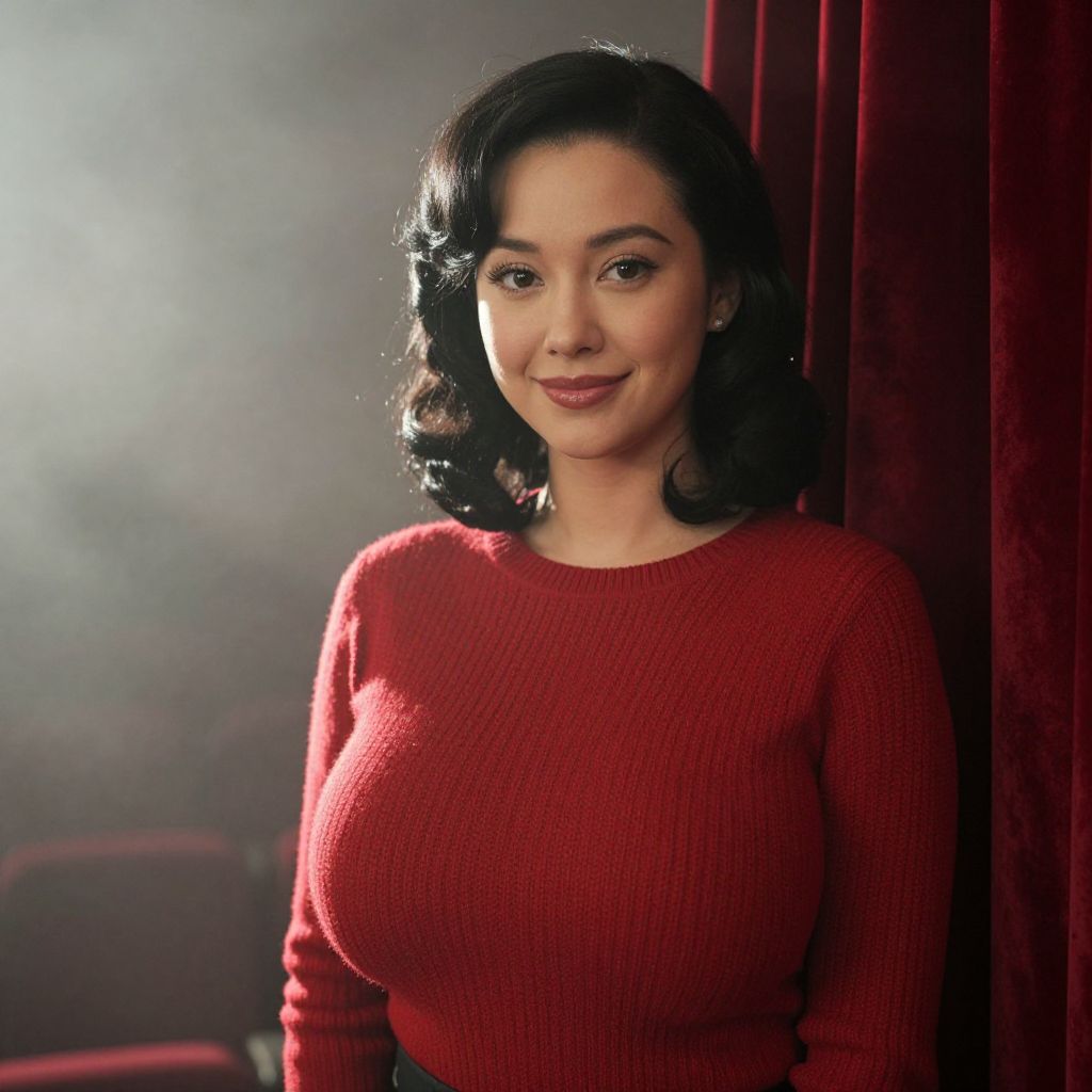 A cinematic still of a woman with medium-length black hair and a gentle smile wearing a red wool sweater as a themed costume, standing inside a vintage movie theater with foggy lighting and a red velvet curtain behind her, giving off a nostalgic, film-noir vibe.. The woman has big breasts and cute face