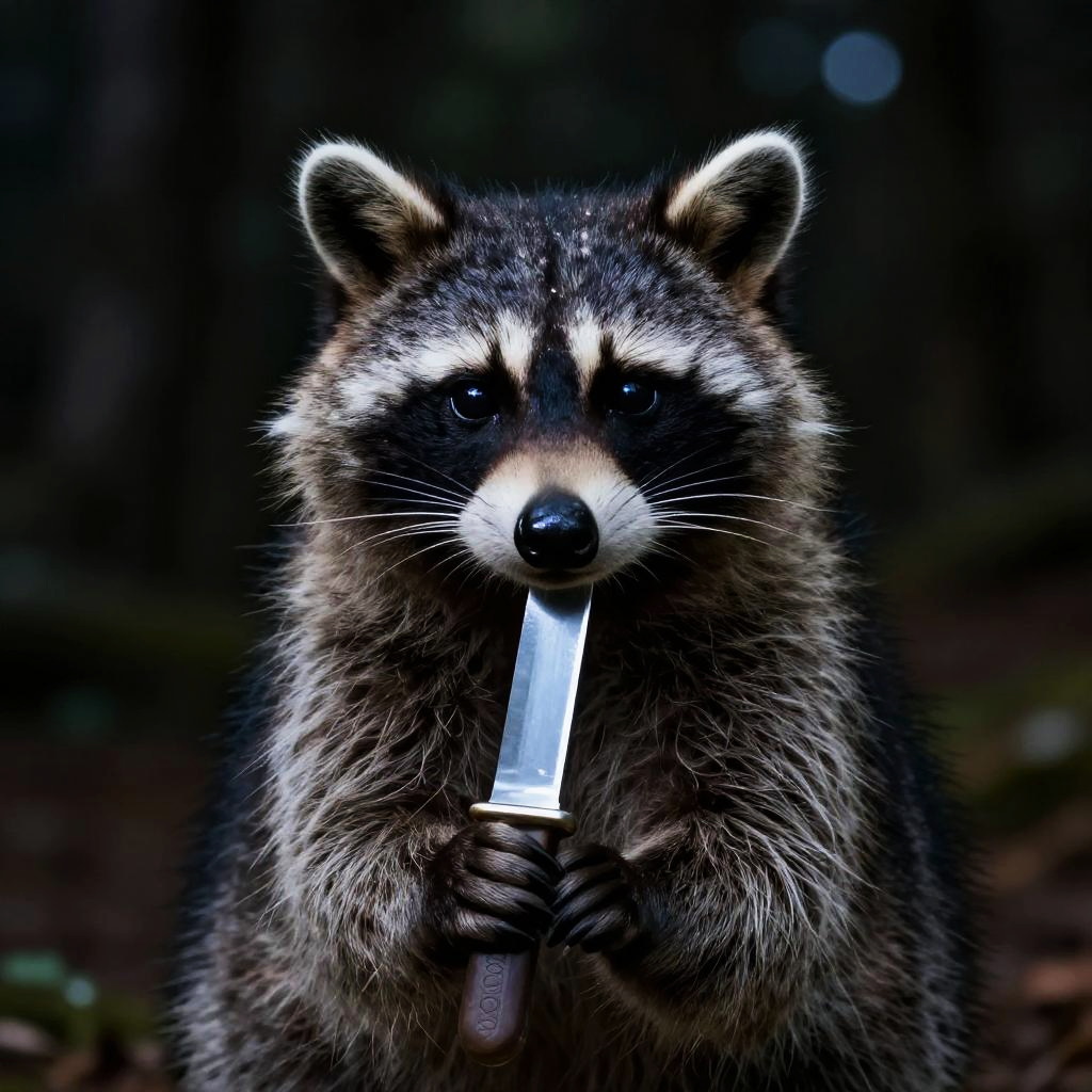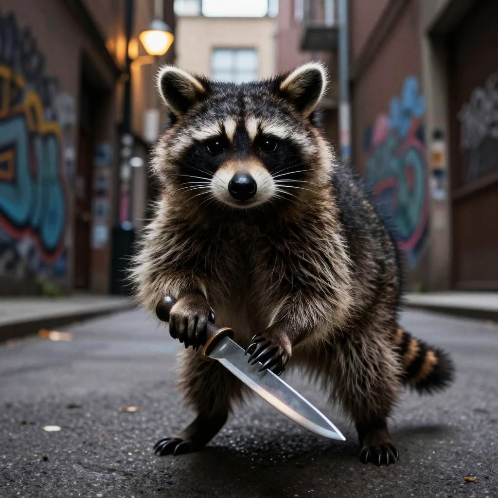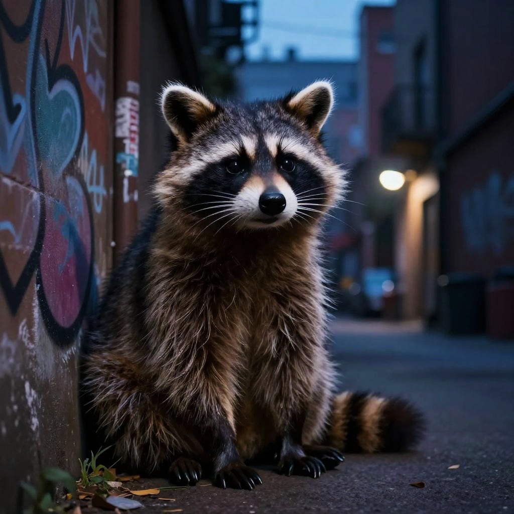 Lowbrow art of a moody raccoon painting graffiti, influenced by Mark Ryden, with an urban alley at midnight, soft lighting, whimsical and surreal