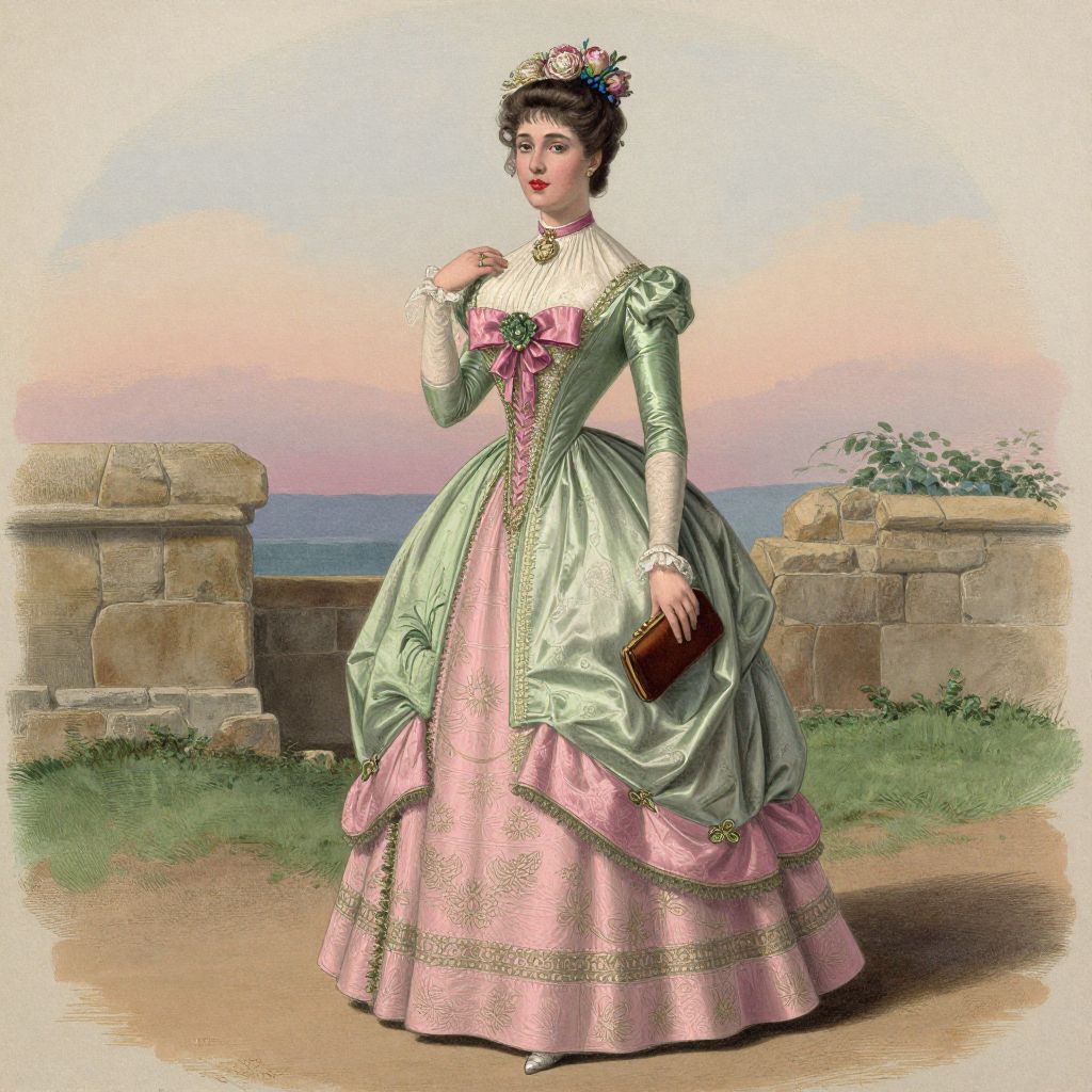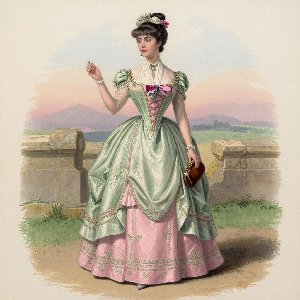 Elegant woman depicted in an 1880s fashion plate, wearing a voluminous green and pink gown with intricate detailing, holding a small brown clutch, and adorned with a floral hair accessory, set against a pastoral backdrop featuring a stone structure.