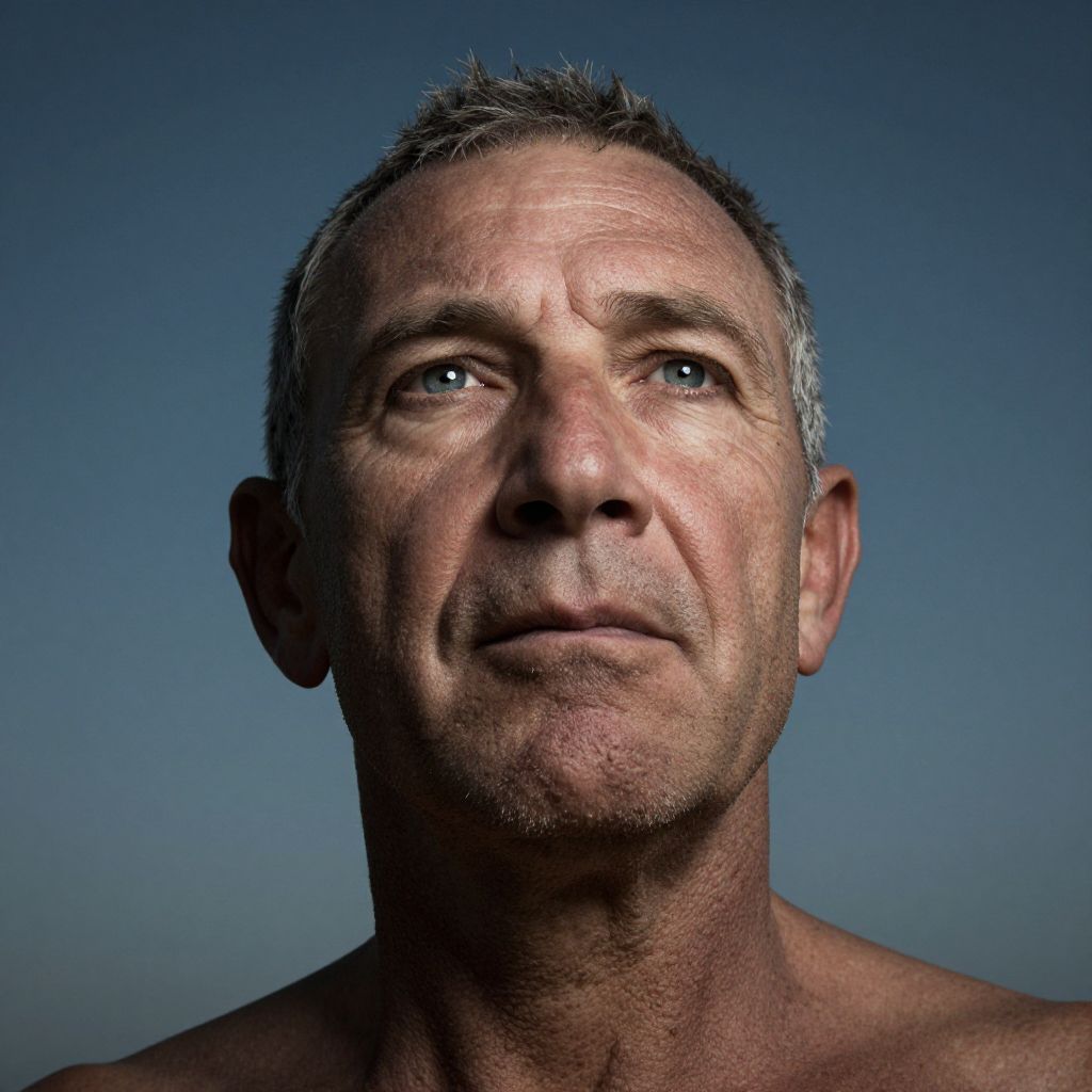 This is a photograph of a middle-aged, Caucasian man with short, graying hair and light blue eyes. He has a tanned, weathered complexion with visible wrinkles and a slight stubble on his chin. His expression is neutral, with a hint of contemplation. He is shirtless, revealing a muscular, broad chest. The background is a gradient of deep blue to lighter blue, providing a stark contrast to his skin tone. The lighting highlights his facial features, casting subtle shadows. The image is sharply focused, emphasizing the texture of his skin and hair.
