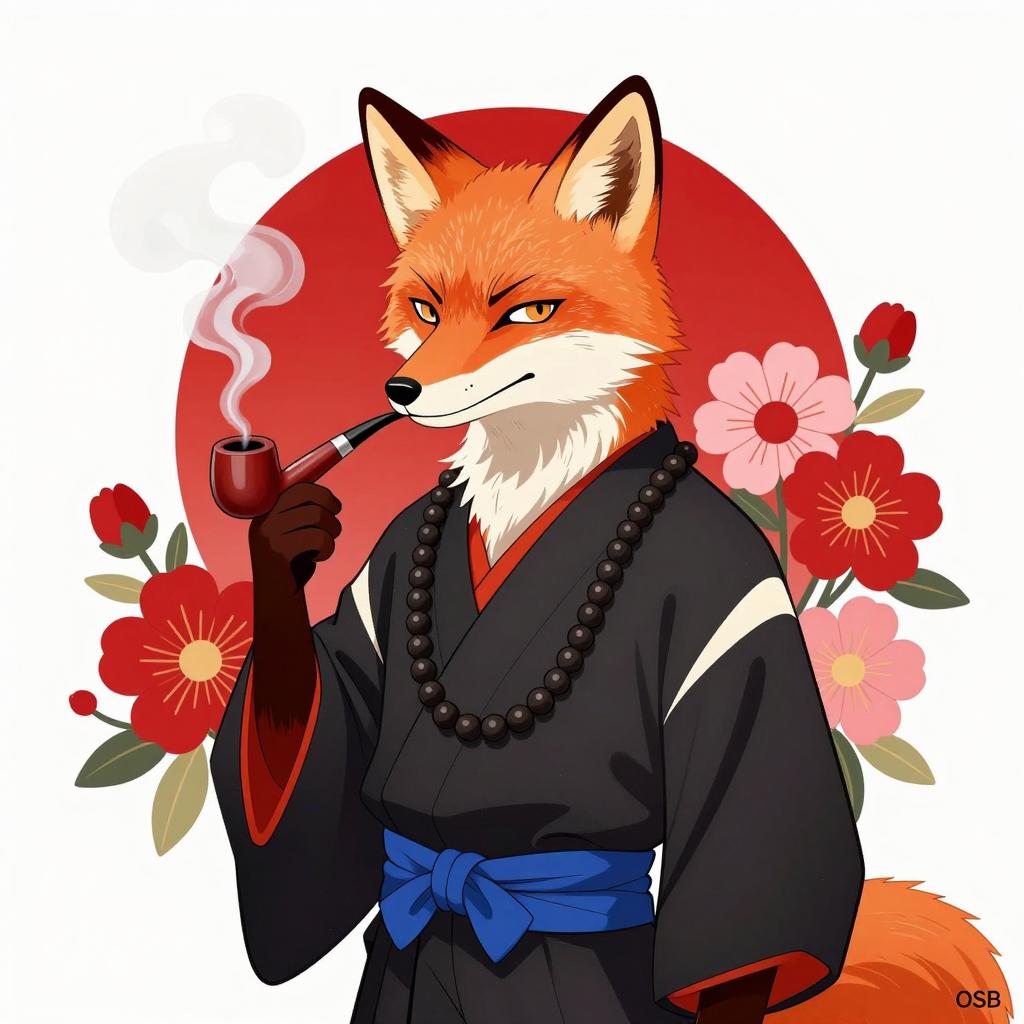 Illustration of an anthropomorphic fox with a stern expression. The fox wears a black kimono with blue and white accents, a bead necklace, and holds a smoking pipe with white smoke swirling around. Red and pink flowers surround the fox, and a large red circular background is behind. Fox's right paw is raised, holding the pipe. The fox's ears are upright, and its gaze is directed to the left. The artist's "OSB '09" is in the bottom right corner.