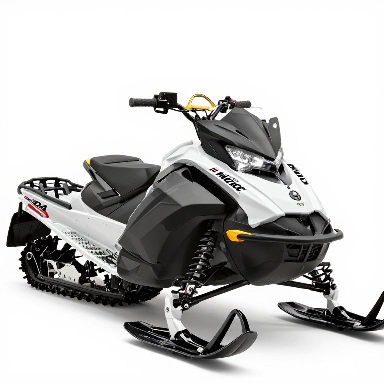 This is a digital rendering of a modern snowmobile. The snowmobile features a sleek, aerodynamic design with a predominantly white body and black accents. It has a sharp, angular front end with a black, helmet-like headlight. The handlebars are black with yellow grips, and the snowmobile is equipped with large, black, treaded tracks. The seat is black with white detailing, and the rear section includes a small, black storage compartment. The snowmobile's design is highly stylized, with sharp lines and a glossy finish, suggesting a high-performance model. The background is entirely white, making the snowmobile the central focus of the image.