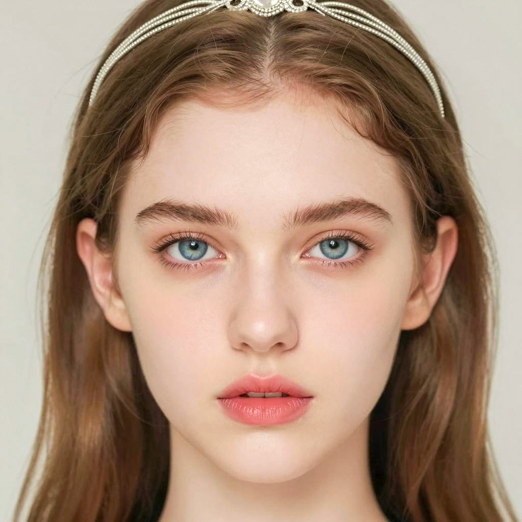 Photograph of a young woman with fair skin and blue eyes, wearing a white lace dress and a flower crown with pink and white roses and small greenery. Her brown hair is loosely pulled back with soft waves. She has a neutral expression, looking directly at the camera. The background is a plain, light gray. She has light pink lips and subtle blush. Her shoulders are visible, and she is centered in the frame.
