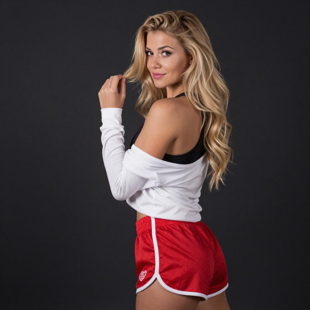 Photograph of a young blonde woman with long, wavy hair, wearing a black tank top, white long-sleeve shirt draped off her shoulders, and red athletic shorts with white patterns. She stands against a black background, looking over her shoulder with a slight smile, her right hand touching her hair.