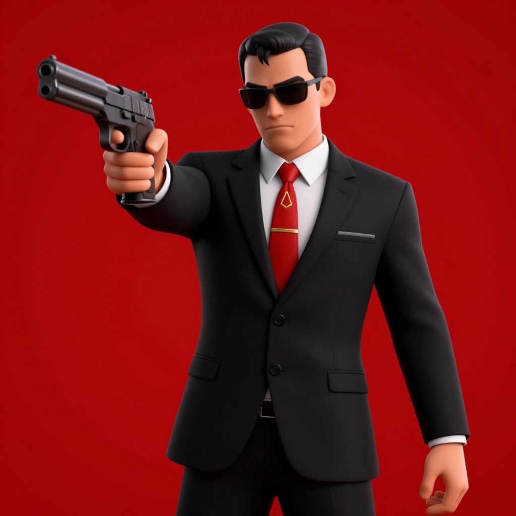 3D CGI of a suave man in a black suit, red tie, and sunglasses, pointing a gun forward against a solid red background.