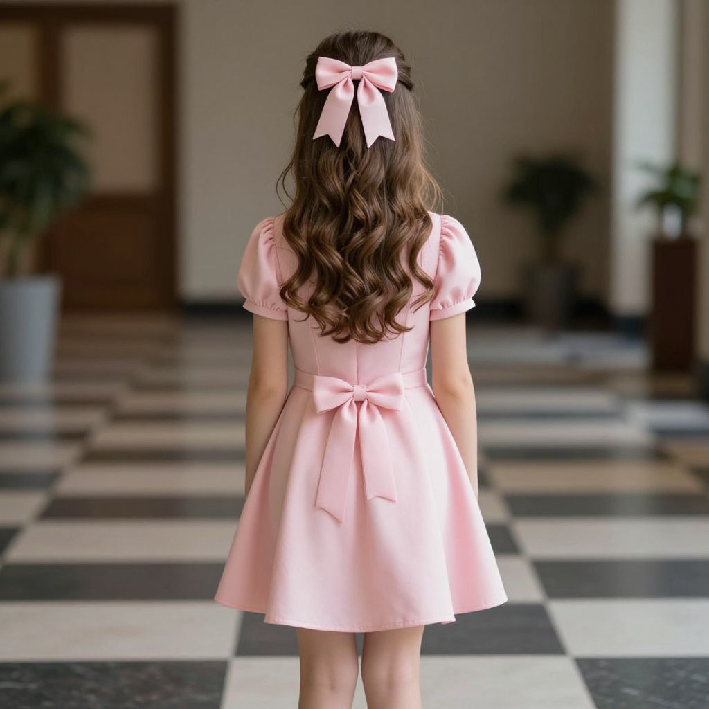 Photograph of a young girl standing with her back to the camera in a checkered black-and-white tiled hallway. She has long, wavy brown hair adorned with a large pink bow. She wears a short-sleeved, pastel pink dress with a bow at the waist and a flared skirt. The hallway is softly lit, with blurred potted plants visible in the background. The girl's dress and bow create a soft, feminine contrast against the geometric floor pattern. The overall scene is gentle and nostalgic, evoking a sense of innocence and simplicity.