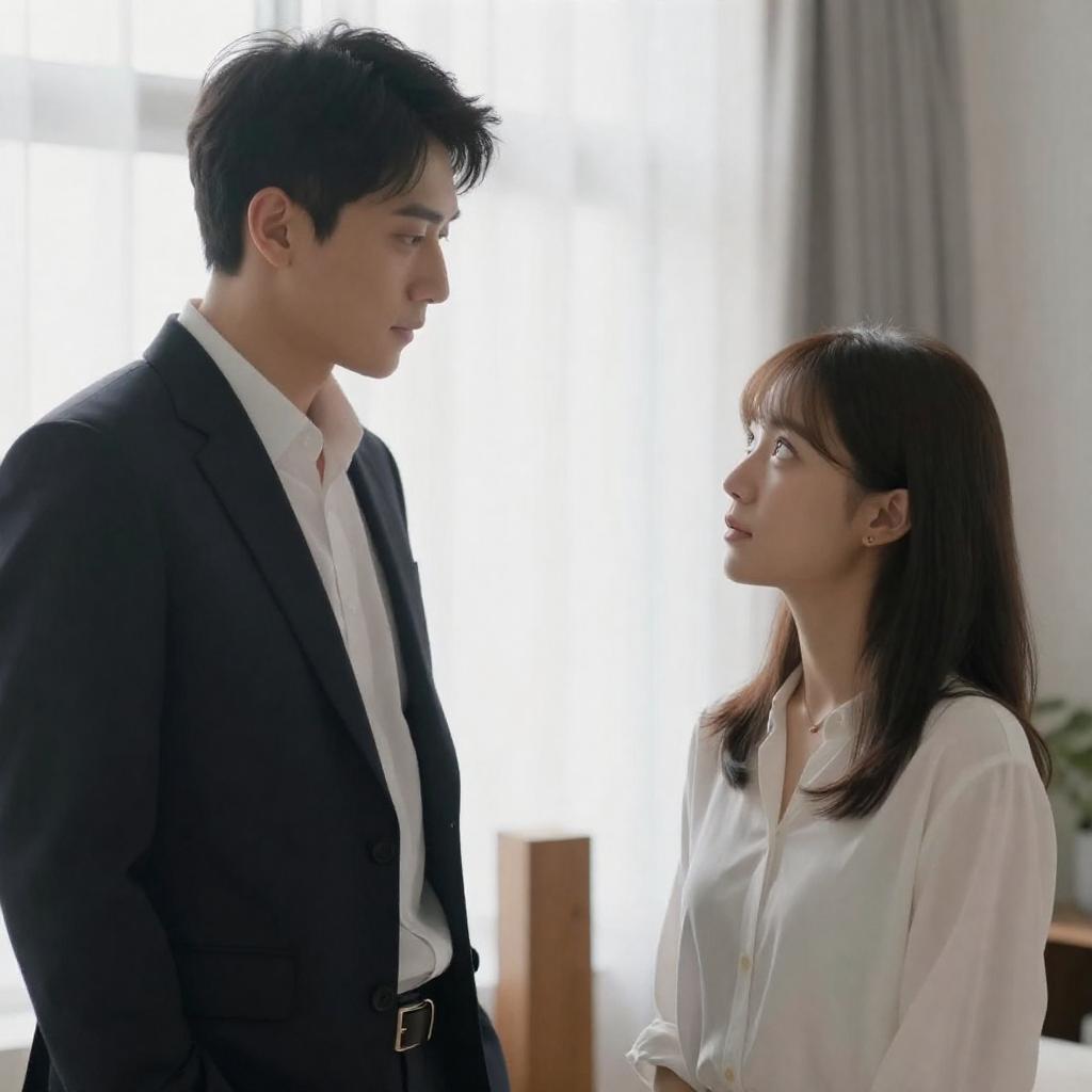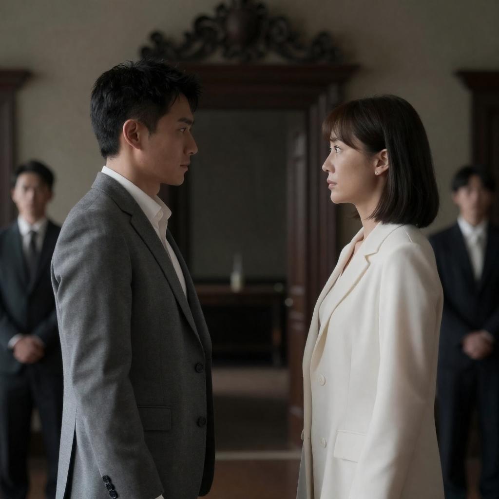 Photograph of a man and woman in a brightly lit room. The man, in a dark suit, stands on the left, looking down at the woman, who has dark hair and wears a white blouse. She looks up at him with a serious expression. A wooden object is between them.