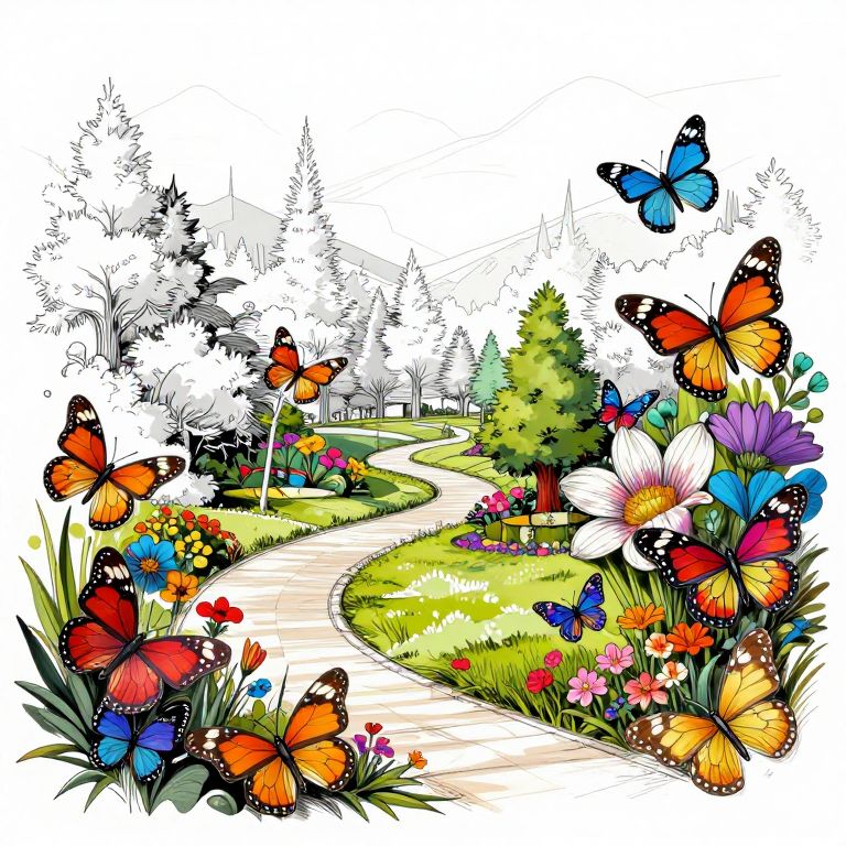 Vibrant digital illustration of a winding path through a colorful garden, surrounded by orange, blue, and black butterflies, and lush flowers.