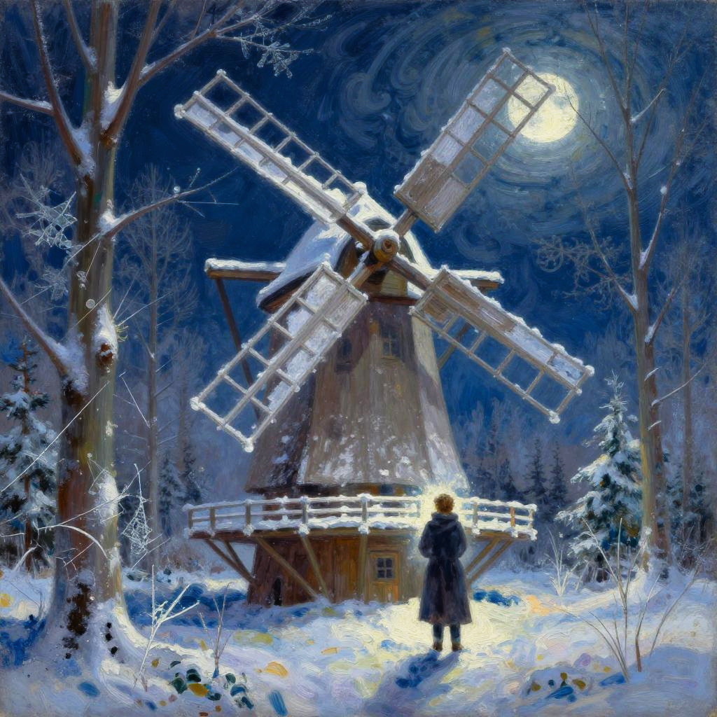 An incredibly winter mystical landscape featuring a crystal-clear frozen pond in a night forest on a moonlit night with a graceful ice dancer standing in front of it, in the style of an original painting that organically combines influences from Edgar Degas, Paul Gauguin, Henri Rousseau, yet adds a unique original style. Interesting, well-chosen and well-combined colors, high clarity and contrast in the picture fragments, oil painting, heavy brush strokes, hand-crafted look, masterpiece quality, with a Broken Glass effect, no background, mythical presence, mica-like sparkling frost and snowy textures, capturing breathtaking beauty, pure perfection, and a divine aura. Volumetric light, auras, radiant rays, vivid color reflections, an unforgettable and impressive scene.