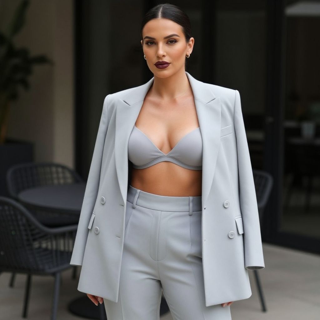 Photograph of a confident woman with dark hair in a sleek, low bun, standing outdoors. She's wearing a light gray, double-breasted blazer over a matching bralette, paired with high-waisted pants. Her makeup is bold with dark lipstick. The background shows a modern patio with dark chairs, a round table, and glass doors. The lighting is soft, highlighting her chic, professional look.