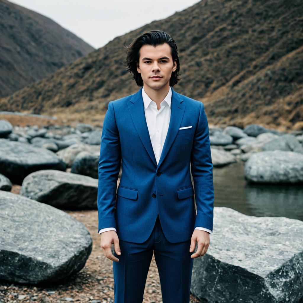 Harry styles blue suit dress ,1boy, male focus, solo, shirt, jacket, pants, white shirt, outdoors, realistic, suit, collared shirt, standing, looking at viewer, rock, arms at sides, formal, blue pants, closed mouth, black hair, blue jacket, grey jacket, long sleeves