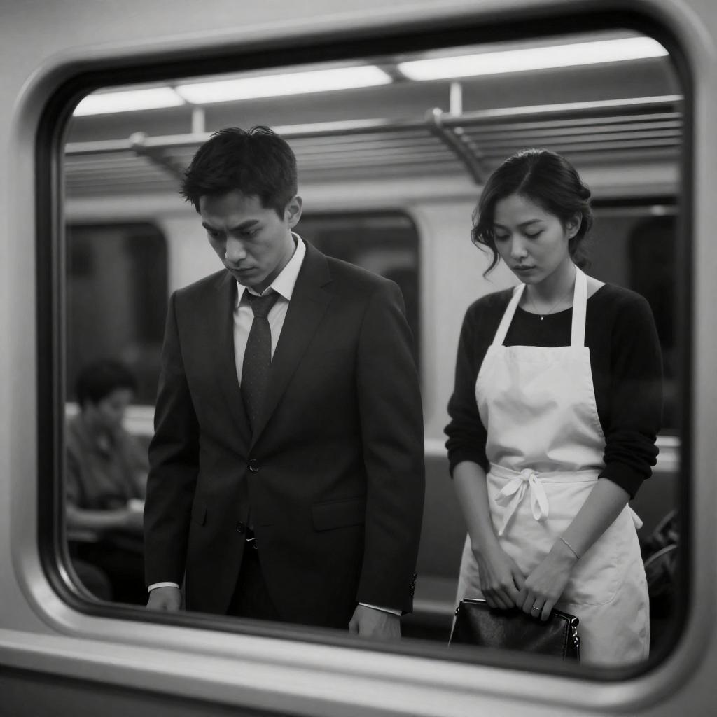 Black-and-white photograph of a man and woman on a train. Man in dark suit with intense expression, woman in black top and white apron, holding a purse, looking down. Train window in foreground, reflections visible. Both standing. Train interior, dim lighting.