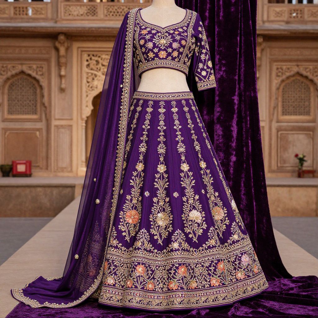 A luxurious lehnga in royal purple with floral motifs and hand-embroidered patterns, displayed on a velvet background in a heritage fashion show setting with vintage Indian architecture in the background. Elegant, detailed, high-resolution.