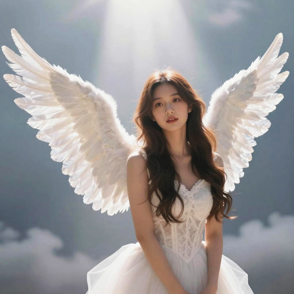 How to add angel wings to a photo, showing a beautiful transformation of a portrait with glowing, ethereal white feathered wings emerging gracefully, soft lighting, a dreamy celestial background with light rays and gentle clouds, high detail, fantasy art style.