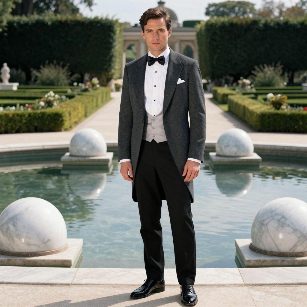 "a man, charcoal gray tailcoat, white dress shirt with pleats, black satin bow tie, black trousers with satin side stripes, glossy black oxfords, light gray waistcoat, elegant white silk pocket square, marble domes gleaming in sunlight, surrounded by manicured gardens, tranquil reflecting pools, lithographic film style, confident expression. Man has masculine face and piercing eyes"