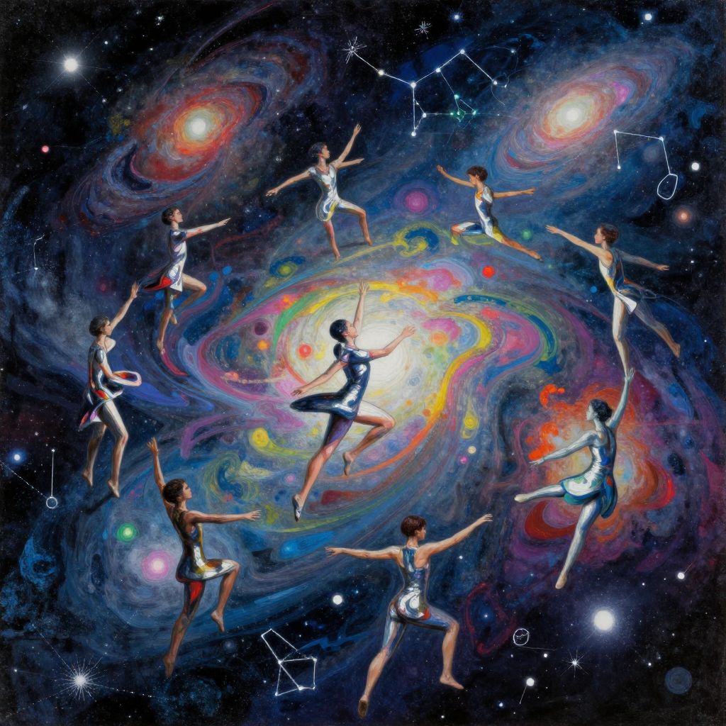 Envision an abstract digital artwork reminiscent of Kandinsky's dynamic color palettes and fluid brushstrokes. The composition showcases a celestial dance, with dancers in sleek, metallic attire pirouetting among cosmic constellations. From a high vantage point, the choreography unfolds, highlighting its intricate elegance against a backdrop of swirling nebulas and far-off galaxies. Each dancer's movements synchronize with the cosmos' rhythmic pulse, their steps echoing the stardust beneath them, creating an awe-inspiring spectacle that bridges human grace with celestial majesty within the vast universe.