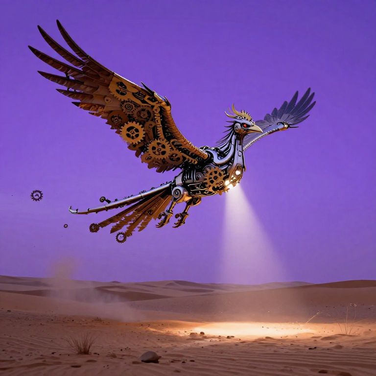 Create an otherworldly desert scene where gravity seems to bend as objects drift aimlessly under a vibrant purple sky. This surreal landscape features a phoenix hybrid, half-bird and half-mechanism, soaring through the air with wings adorned in intricate gears. The creature casts a mystical light on the barren terrain below, creating a striking contrast between the industrial elements of its design and the desolate ground. The image should inspire a blend of wonder and contemplation as viewers are drawn into this fantastical realm that merges fantasy with surrealism to explore the enigmatic nature of time and reality.