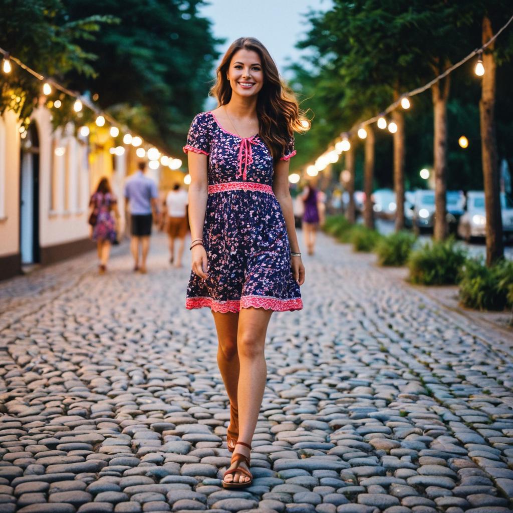 Casual night out outfit, photograph of a young woman walking on a narrow, cobblestone street at dusk, wearing a colorful, short-sleeve, floral-patterned dress with a pink and purple trim, brown ankle-strap sandals, long wavy brown hair, smiling, street lined with greenery on the left, string lights illuminating the background, blurred people walking in the distance, bokeh effect, warm and soft lighting, summer evening, casual and relaxed atmosphere