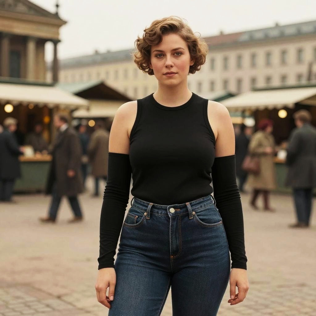 A Curvy woman in a casual street style, wearing a sleeveless black tank top with open-shoulder long sleeves and dark denim skinny jeans, stands in a bustling market square in 1910s Berlin, captured in a vibrant wit studio visual style. Sexy. Pretty face and beutiful eyes