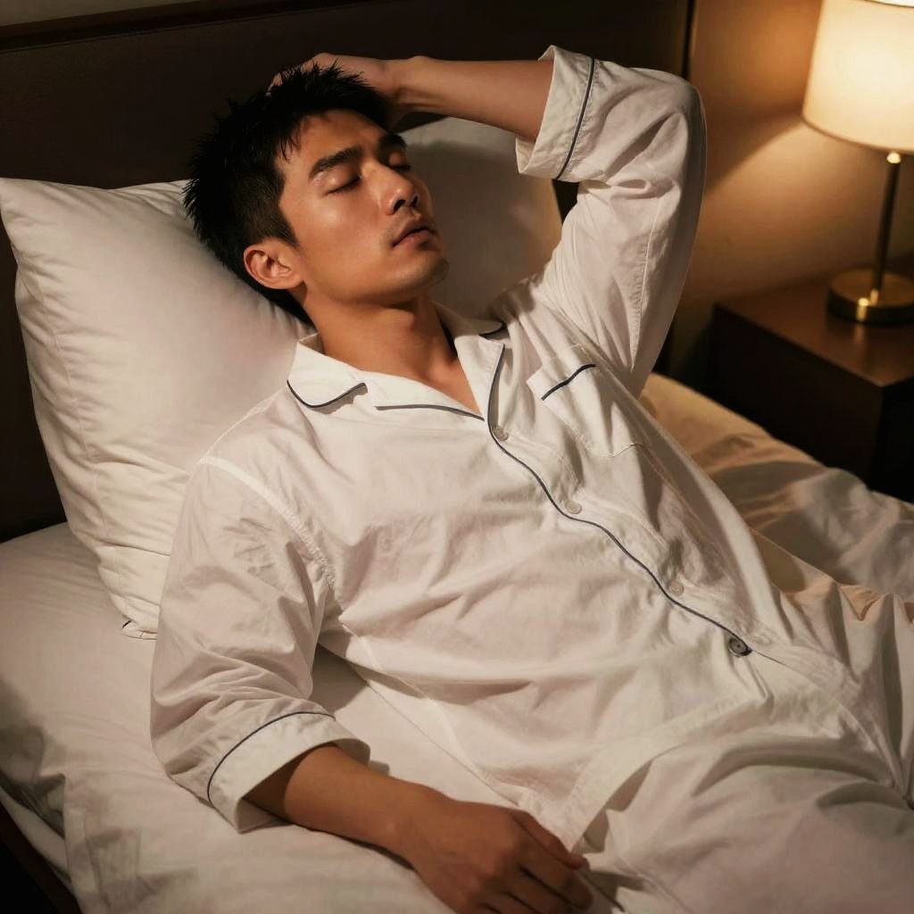 A handsome Asian man with short black hair is lying on a bed at night, wearing loose white cotton pajamas with dark piping. His eyes are closed and mouth slightly open, showing a relaxed expression. He is partially turned on his side with one hand resting above his head. The scene is softly illuminated by a warm bedside lamp, casting gentle shadows and highlights.