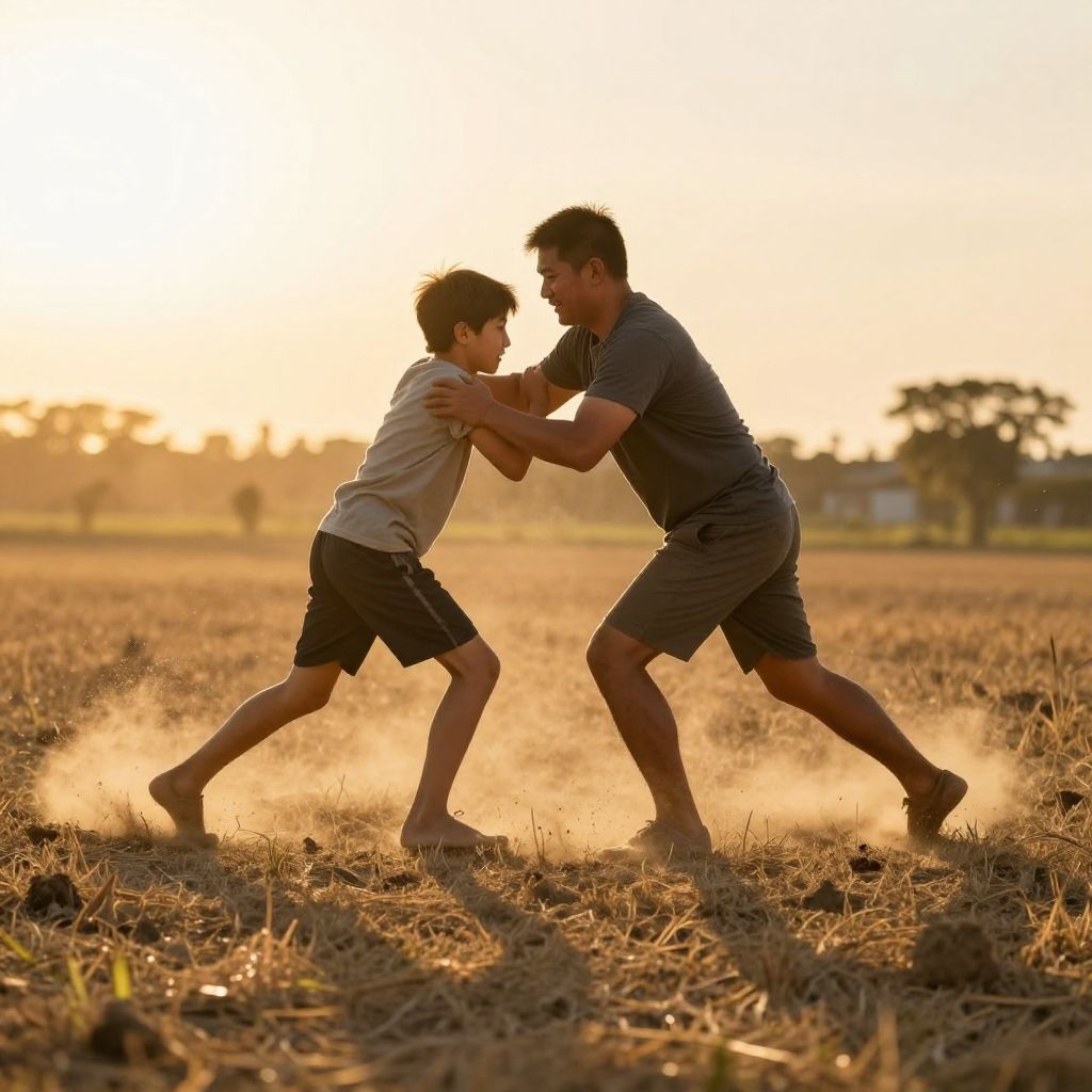 Father and son wrestling in a rural field at sunset, golden light casting long shadows, dust kicking up around them, strong bond and competitive spirit shining through dynamic poses.