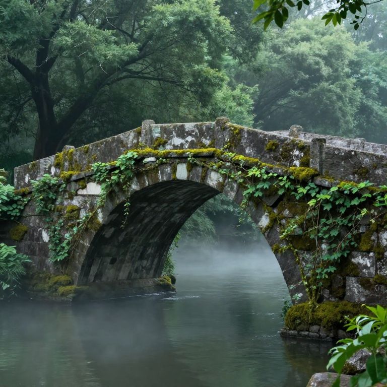 Photograph of a moss-covered, stone arch bridge spanning a misty, calm river. The bridge, with visible moss and ivy, has a worn, gray texture. Dense, green foliage surrounds the scene, with large trees in the background. Mist gently rises from the river, adding a mystical atmosphere. The bridge's arch is centered, and the river reflects the greenery and mist. The overall color palette includes greens, grays, and soft whites, with a serene, natural, and slightly overgrown aesthetic.