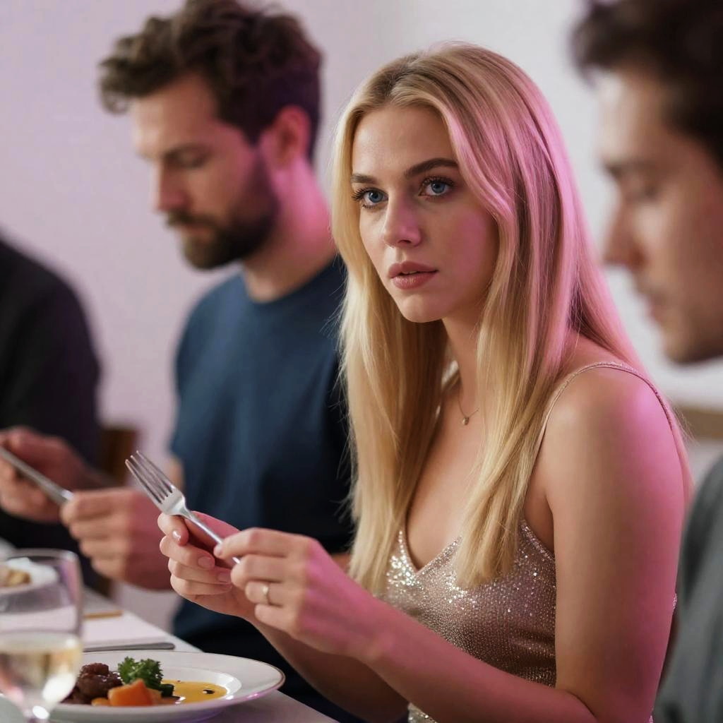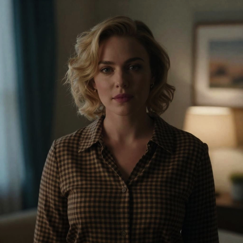 Blonde woman with curled hair, wearing a white dress, on hands and knees, holding flashlight, searching on wooden floor. Small toy figures scattered around. Lamp in background, window with white curtains. Intense expression. Living room setting. One person.