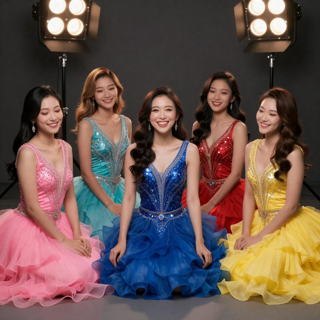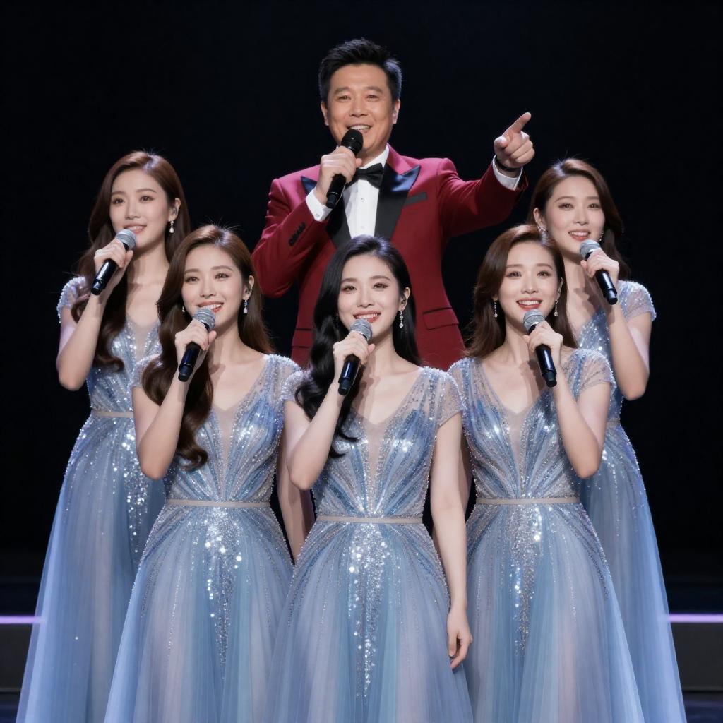 Dancing group on stage. Five people, three women, two men. Women wear sparkling dresses, one in white, two in black with gold patterns. Men wear formal attire, one in white shirt, one in black. Arms raised, enthusiastic expressions. Background with draped curtains, string lights, and a flower arrangement on the right. One man in background speaks into microphone. All standing close together.