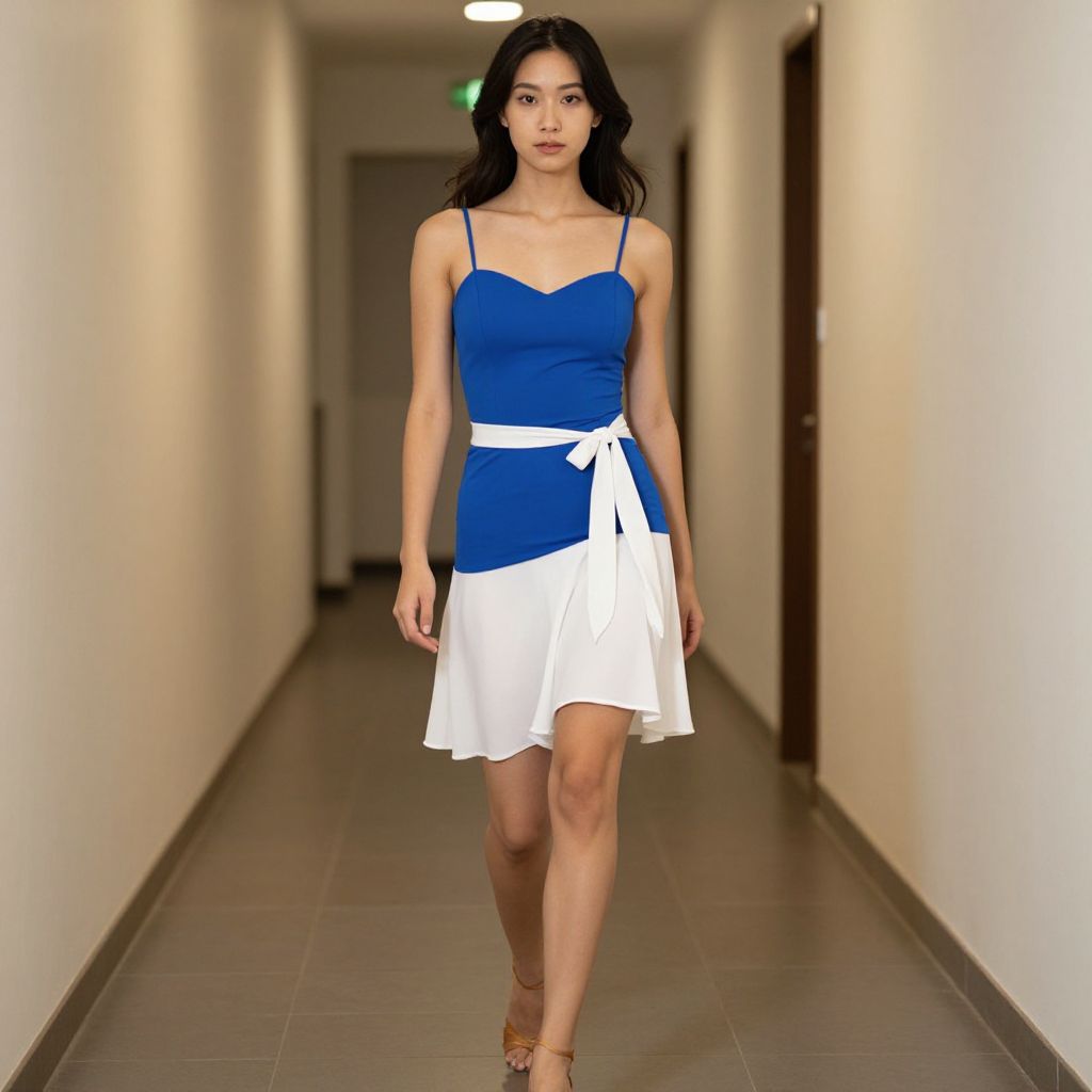 Photograph of an Asian woman with long, wavy black hair walking down a narrow, brightly lit hallway. She wears a blue, spaghetti-strap, fitted tank top with a white bow tied at the waist, paired with a white, knee-length, pleated skirt. She has a slim physique and is wearing brown, open-toed sandals. The hallway has white walls, dark brown doors on the right, and gray tiled flooring. The woman's expression is neutral, and she looks directly at the camera. The lighting is even, highlighting her outfit and the hallway's clean, minimalist design.