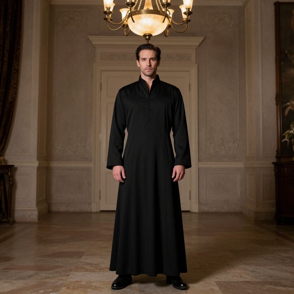 Full Black Costume, man in a black robe standing in a room with a chandelier