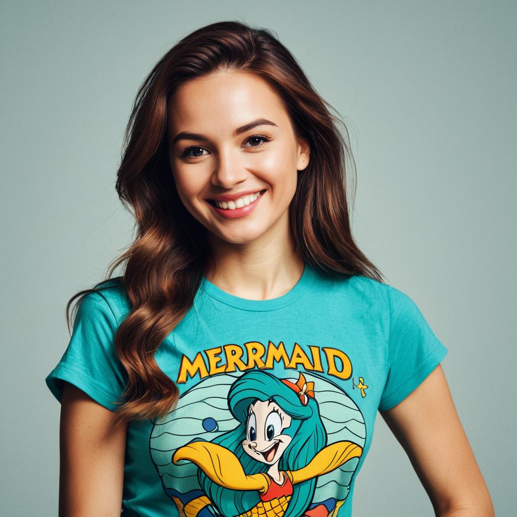 Upper body shot of cheerful mermaid in a t-shirt, in the style of Looney Tunes, bright colors, animated expressions, thin features, character design elements.