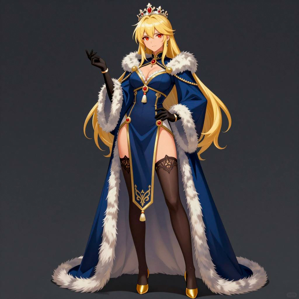 Digital illustration of a blonde woman with long hair, red eyes, and a crown, standing confidently. She wears a dark blue, gold-accented, fur-trimmed robe with high slits, revealing black thigh-high stockings with ornate designs. Her left hand is raised, and her right hand rests on her hip. She has black gloves and gold high heels. The robe has white tassels and a red pendant. Dark background.