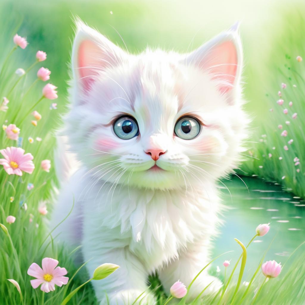 A playful kitten, perfect for a children's picture book, with big curious eyes, a small pink nose, and a cheerful smile. Gentle pastel colors evoke calm and whimsy, with watercolor techniques for a dreamy, ethereal quality. Set in a lush, fantastical landscape with soft grassy meadows, blooming trees, and a gentle stream.