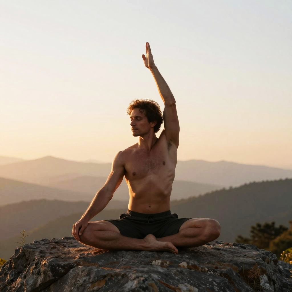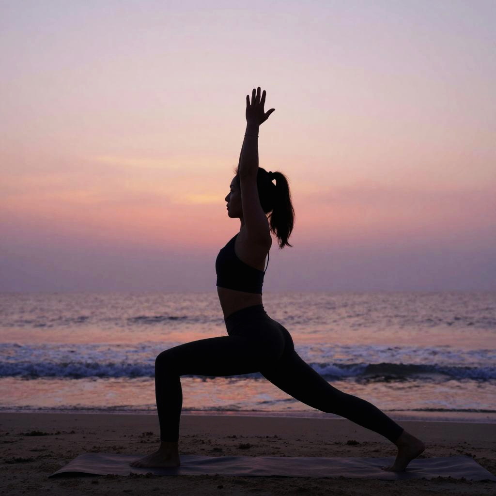 RDJ pose yoga on a sandy beach with gentle waves in the background, golden hour lighting casting warm hues, strong and flexible man in perfect yoga alignment, modern yoga outfit, artistic shadows, meditative atmosphere, inspired by nature and strength training.