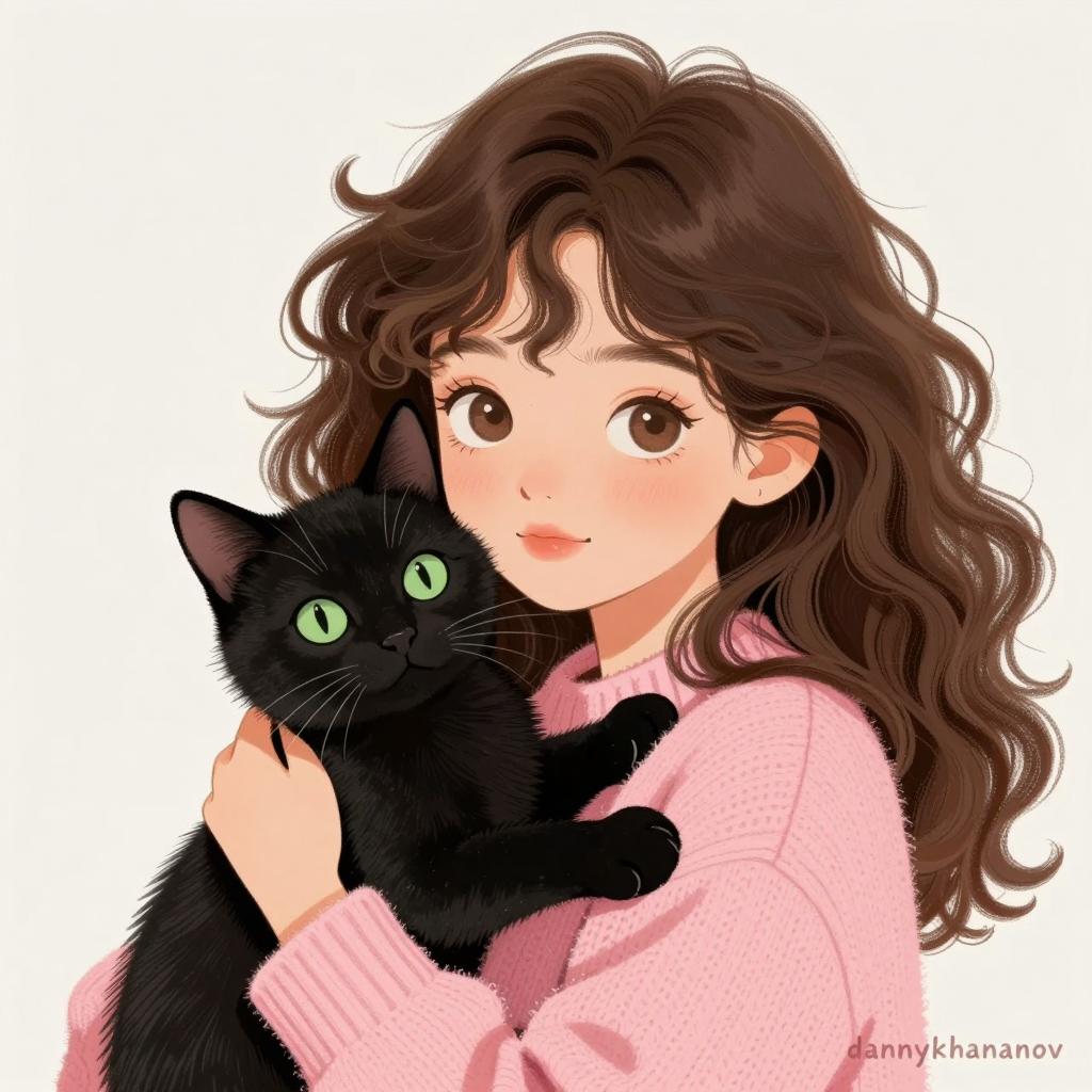 Digital illustration of a young girl with curly brown hair and large brown eyes, wearing a pink knitted sweater. She holds a small black kitten with green eyes close to her face. The girl's expression is gentle and focused. The kitten's ears are pointed, and its body is pressed against the sweater. The background is a plain, light-colored surface. The artist's name "dannykhananov" is in the bottom right corner.