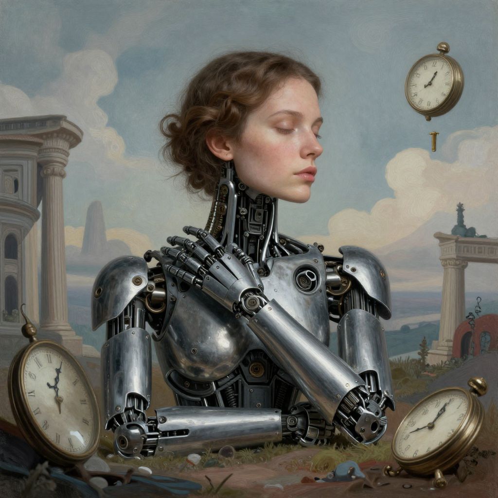 Digital painting of a serene, metallic, human-robot hybrid woman with curly brown hair, surrounded by floating clocks, ancient Roman columns, and a cloudy