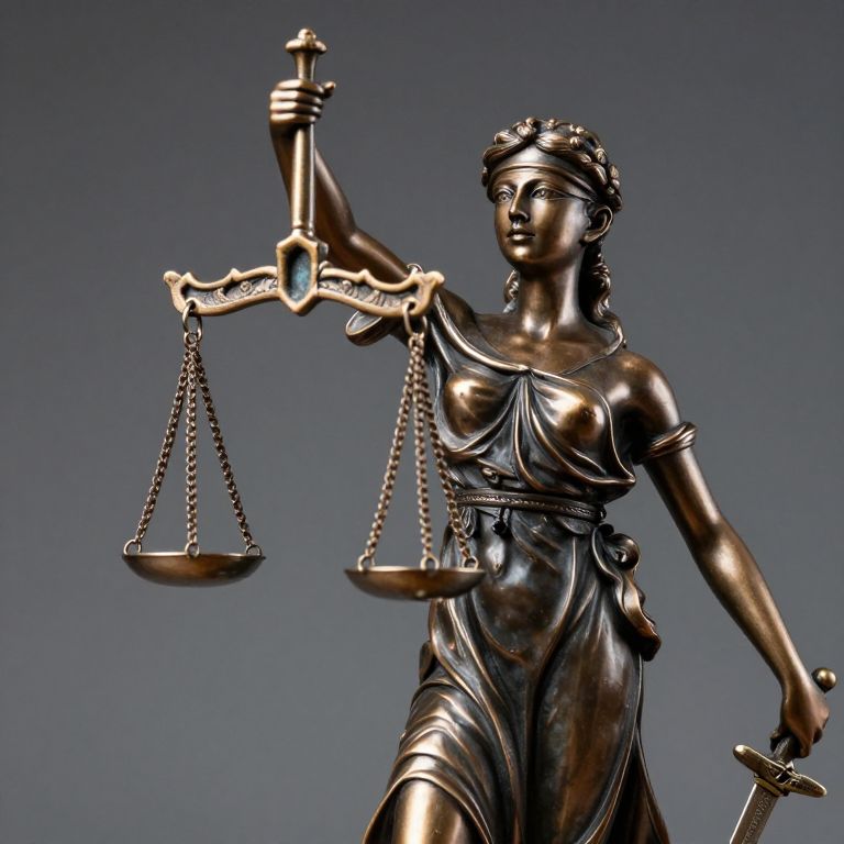 Photograph of a dark bronze statue of a classical-style woman holding a balanced scale in her right hand, symbolizing justice. She has a serene expression, curly hair adorned with a headband, and wears a flowing, draped dress. Her left hand holds a sword with the blade pointing downward. The scale has two suspended pans, and the background is a plain, gradient gray. The statue's polished surface reflects light, highlighting the intricate details of her attire and the balance of the scale.