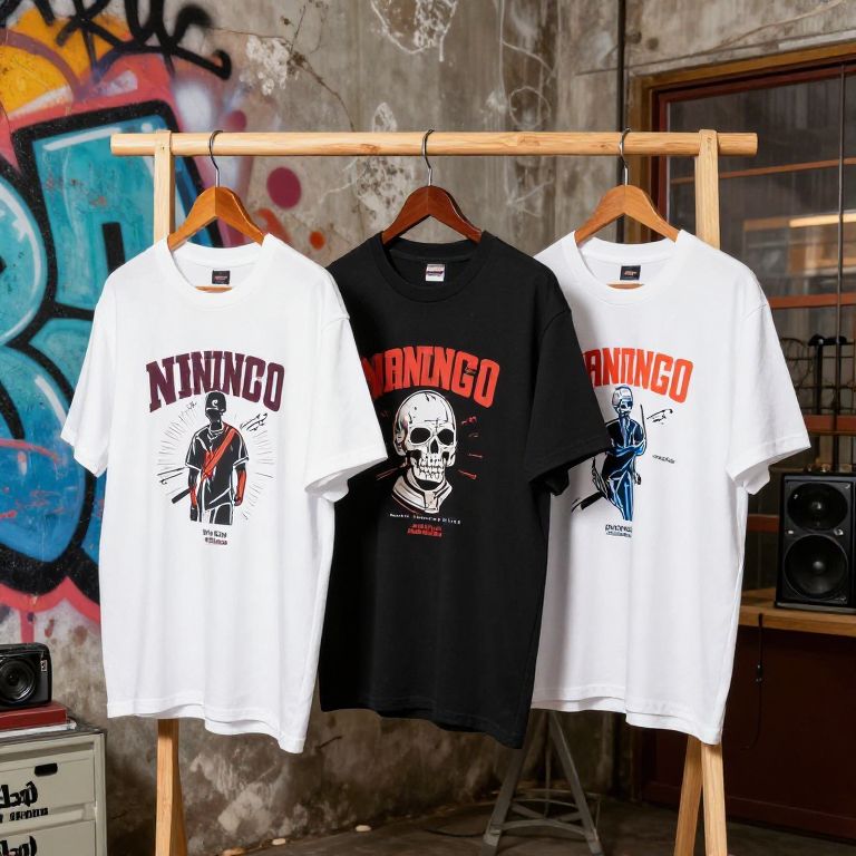 A collection of streetwear graphic tees on a wooden rack, surrounded by graffiti art and urban decor, realistic product photography with depth