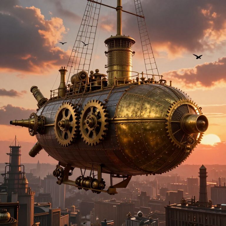 Kv steampunk airship soaring over a sprawling industrial city, detailed with brass gears, rivets, and steam vents, under a dramatic sunset sky filled with clouds and birds, combining classic Victorian design with advanced mechanical innovation
