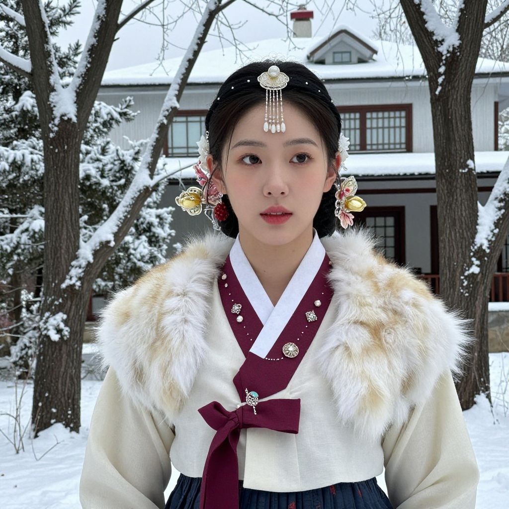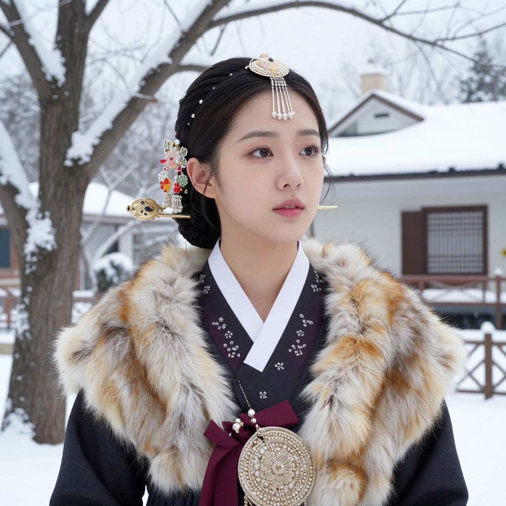 Elegant traditional attire adorned with fur and intricate jewelry stands out as a young woman gazes ahead, framed by snow-covered trees and a classic house in the background, embodying the essence of K-Pop and K-Drama aesthetics.