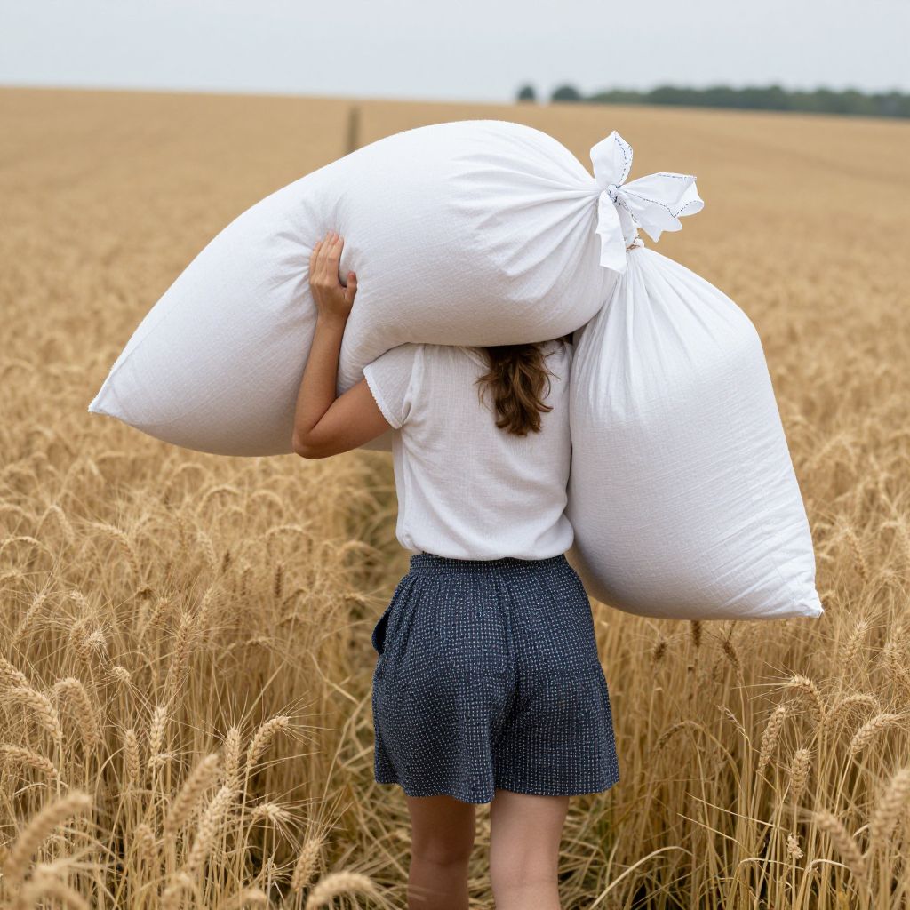 Woman standing amidst golden wheat fields, her back turned as she carries two large white sacks—one slung over her shoulder and the other held in her hand—each tied with delicate bows, evoking a sense of nostalgia and purpose in the tranquil rural landscape.