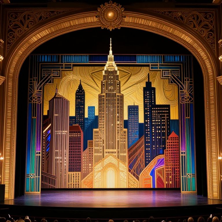 Pieter Brueghel art deco, new york city skyline, backdrop, musical theatre set, stage, proscenium arch, stylized, jazz age, colorful, opening night, glamorous, opulent v5,