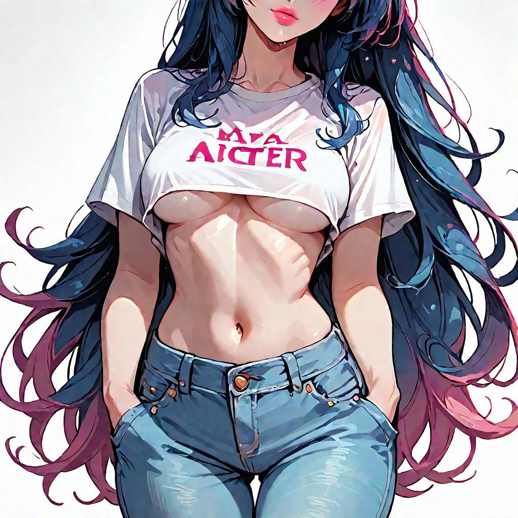 Score_9, score_8, aatakane, solo, long hair, hairband, medium breasts, t-shirt, white shirt, clothes writing, underboob, midriff, jeans, hands in pockets