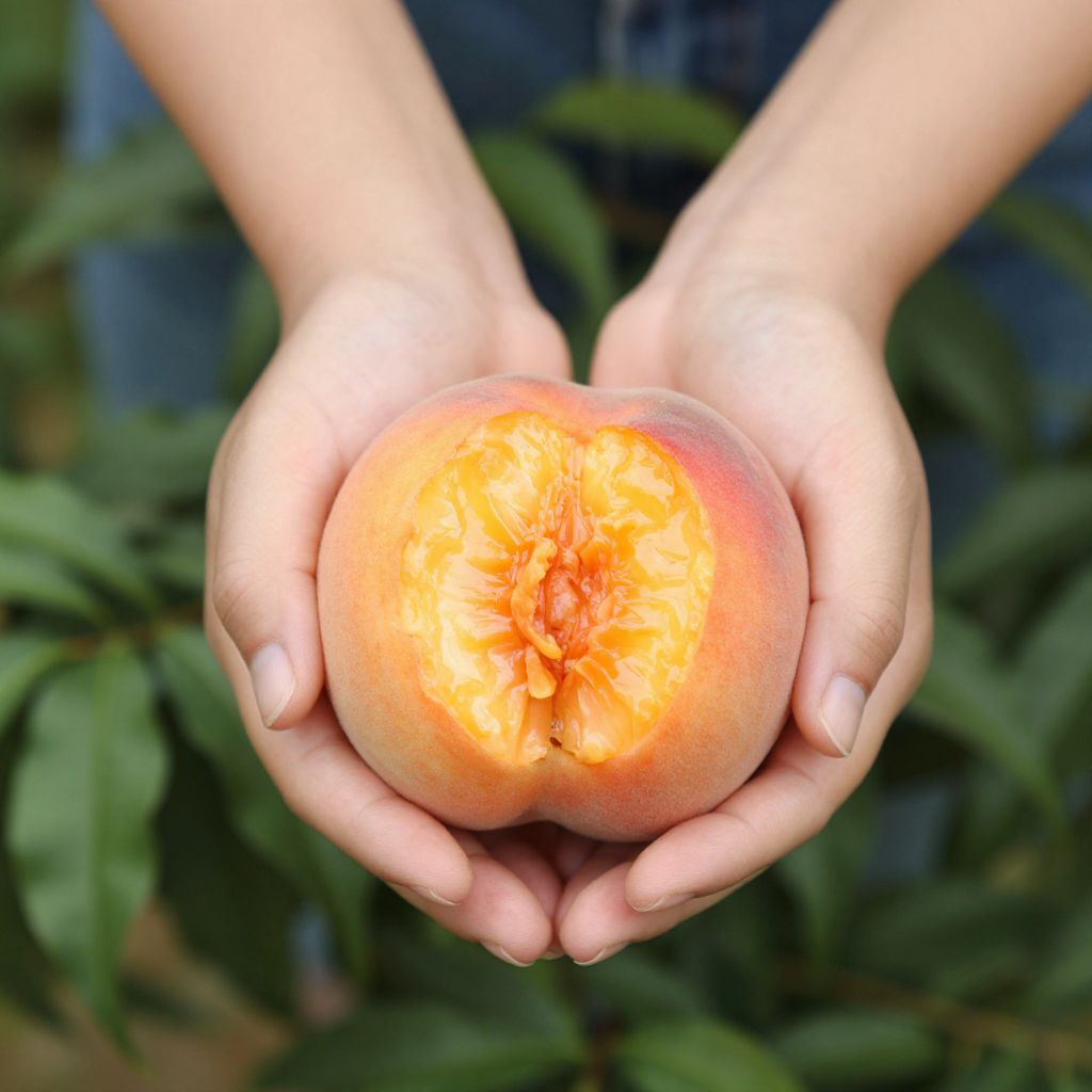 Woman's hands cradle a freshly picked peach, split open to reveal its vibrant orange flesh, set against a backdrop of lush green foliage.