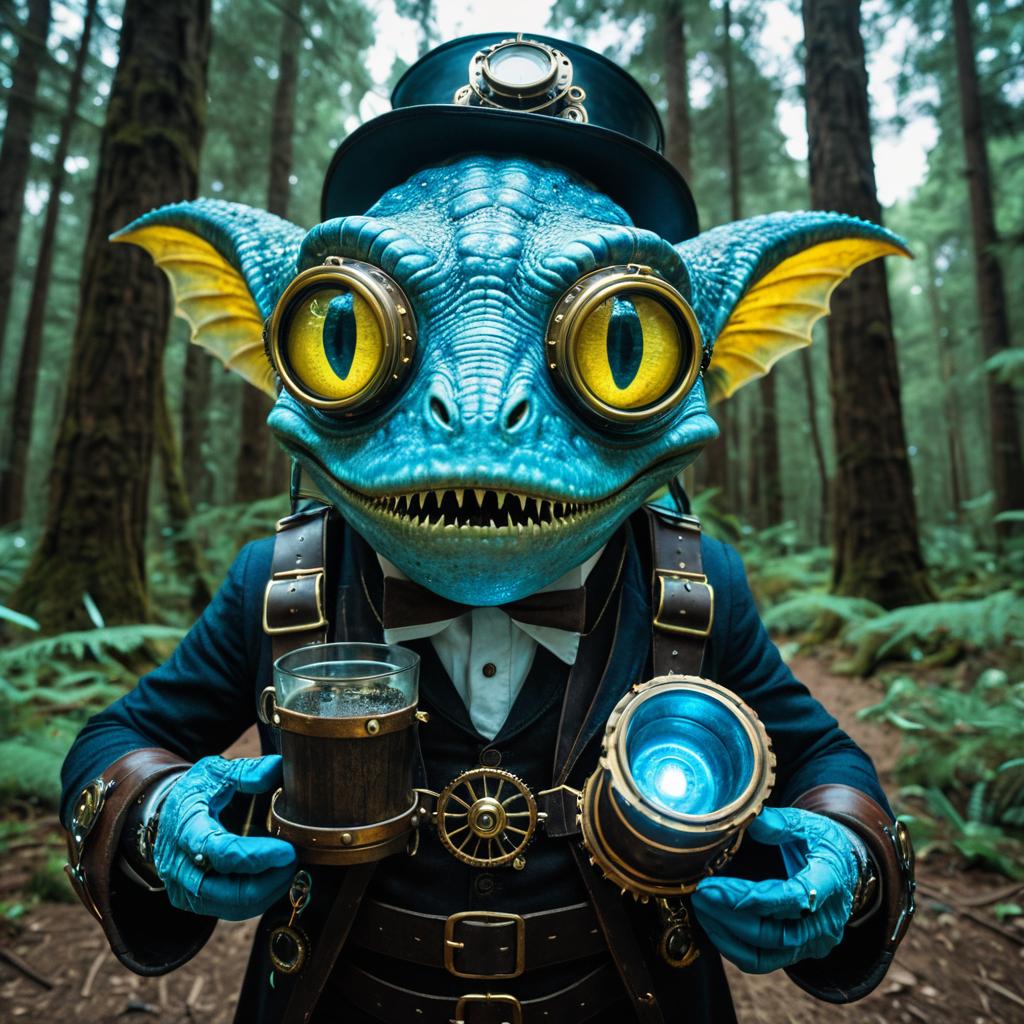 Wide-angle shot of a small blue furry gremlin with big yellow eyes and a giant mouth, wearing leather backpack and bracelets, holding old-school beakers, photorealistic with raytracing, set in a bright forest, 4K resolution