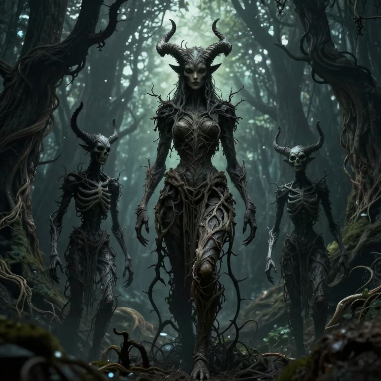Digital art: Dark forest with eerie, horned, skeletal demon figures with twisted, vine-like bodies, standing in a misty, shadowy background