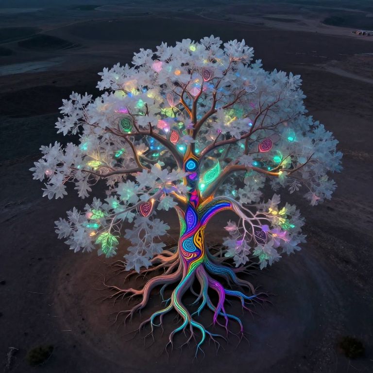 A fantastical tree with translucent leaves emitting soft, glowing light in various hues stands alone on a barren landscape, its roots twisting and curling beneath the surface like veins of color. This unique blend of styles creates a dreamlike atmosphere that provokes a sense of wonderment and curiosity about the mysterious origins and purpose of this luminescent arboreal marvel, reminiscent of intricate patterns found in Islamic architecture and the vibrant colors of pop art. Viewed from an aerial perspective, the scene reveals both the grand scale of the tree and the stark contrast between its beauty and the desolate surroundings, inviting viewers to explore the captivating fusion of these distinct artistic influences.