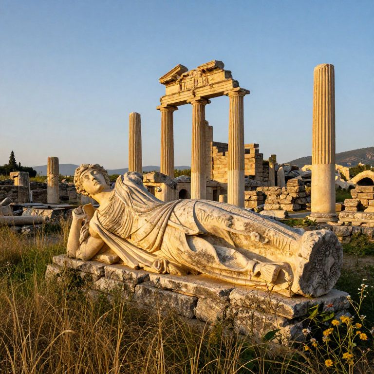 Photograph of a sunlit ancient Greek ruin featuring a reclining marble statue of a draped figure, surrounded by tall columns and a partially intact temple against