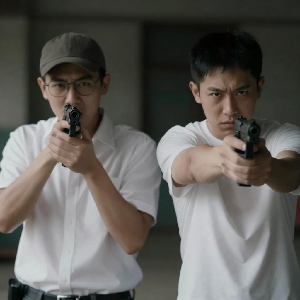 Photograph of two men in a dark, gritty setting. The man on the left wears glasses and a cap, holding a gun to his mouth. The man on the right, with short dark hair, points a gun forward aggressively. Both wear white shirts. The background is blurred, emphasizing their intense expressions and actions.