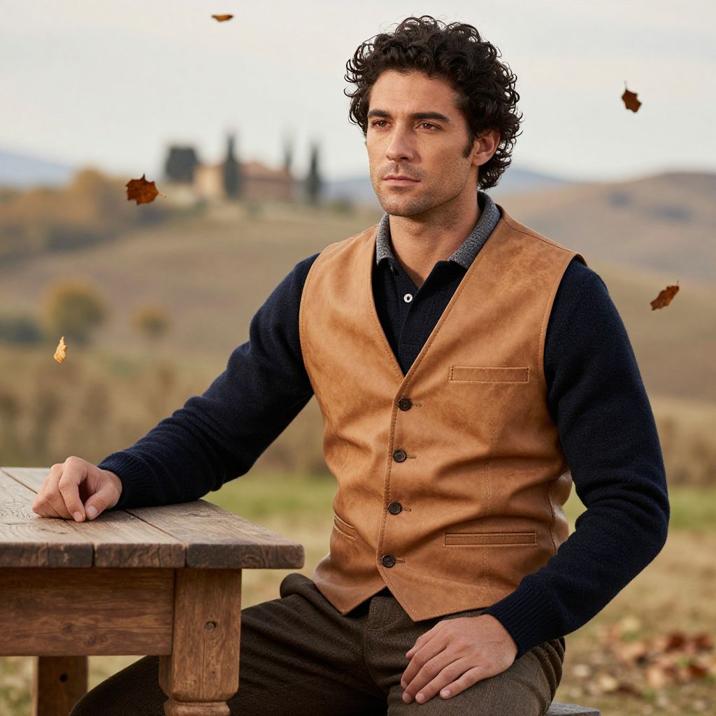 A lifestyle photo of a man in his 30s with a strong jawline and dark, curly hair, wearing a camel leather waistcoat layered over a dark wool shirt, sitting at a rustic farmhouse table in the countryside of Tuscany, with autumn leaves gently falling around him.
